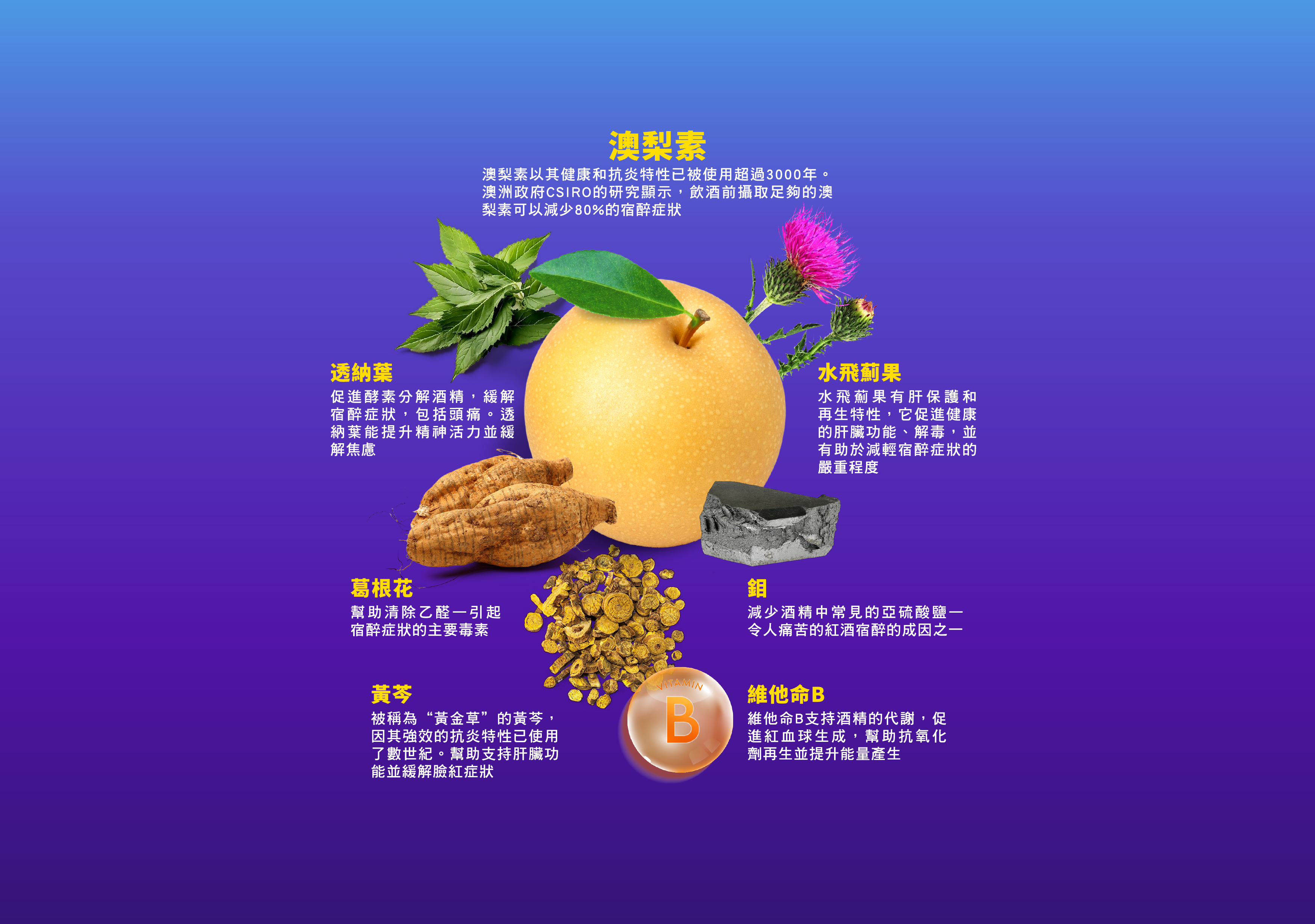 納西梨 (亞洲梨) 因其健康和抗炎特性而被使用了 3000 多年。 澳洲政府CSIRO的研究顯示,飲酒前攝取足夠的澳梨素可以減少80%的宿醉症狀
